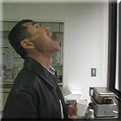 ネオステリンググリーン(歯科用)、アズノールうがい液(または含嗽用アズレン)、イソジンガーグルとの薬理学的な比較を説明した後で、実際に全員にコップ半分(100ml)に対してティートゥリーを2滴入れて、診察室にて含嗽してもらいました。皆さんの感想は、"十分含嗽できる"と好評でした。