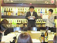 料理を頂きながら、大口酒造:神渡巧研究室長、瀬戸口智子研究室員、他2名のスタッフの監修・準備協力のもと、当セミナー(食事会形式)恒例の香り当てクイズを過去最多の3問実施しました(参加者40名)。