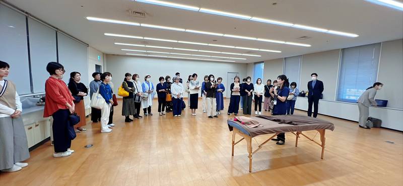 - 講演25分の後、施術の実技を別会場で25分設けました。浮腫アプローチの時間配分は臀部、特に大転子部へのアプローチを長めにしている。キャリアオイルは主にホホバオイルを使用している。吸収するオイルは微量にしか使わず、スキンケアで使用する場合はニベアなど手に入りやすい基材で対応するよう指導している、などと述べられました。